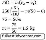 Dalam suatu permainan sepakbola, seorang pemain melakukan tendangan penalti. Tepat setelah ditendang bola melambung dengan kecepatan 50 m/s. Bila gaya tendangan 250 N sepatu pemain menyentuh bola selama 0,3 sekon maka massa bola adalah....