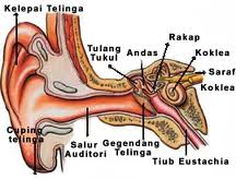 3). Telinga bagian dalam terdiri dari alat keseimbangan tubuh, tiga saluran setengah lingkaran, tingkap jorong, tingkap bundar dan rumah siput (koklea)